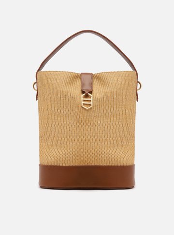 Bolsa Bucket Marrom Média. O acessório tem formato estruturado e acabamento texturizado. Traz alça tiracolo regulável e removível. Possui fecho em imã interno e tampo frontal, com detalhe em metal geométrico com nome da marca.