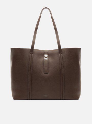 Bolsa shopping grande marrom. O modelo tem formato estruturado e amplo. Traz duas alças bombadas com porta-alça também bombado e costurado às capas, além de fecho superior em zíper. Com inscrição do nome da marca na capa frontal. Acompanha pouch no mesmo padrão da bolsa com fecho em zíper e puxador.
