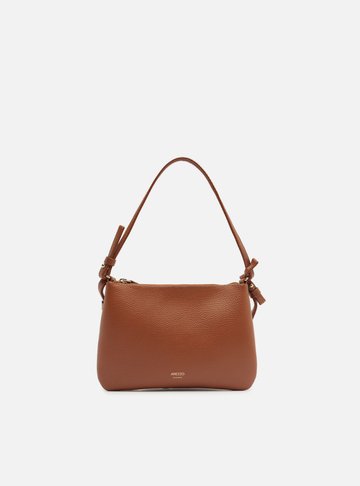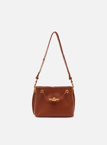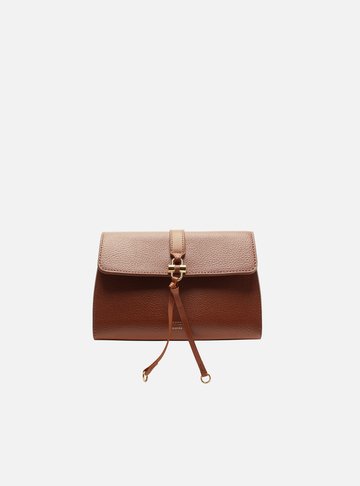 Bolsa tiracolo pequena marrom. O modelo tem formato retangular, acabamento liso e laterais arredondadas. Traz alça lateral em tira fina regulável e alça de mão em corrente metálica. Possui fecho em tampo frontal e imã interno e inscrição do nome da marca na capa frontal.
