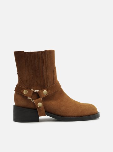 Bota feminina marrom em couro. O sapato tem cano curto, salto baixo fino e ponta fina. Traz cabedal ajustado ao pé e fecho em zíper na lateral interna do cano.