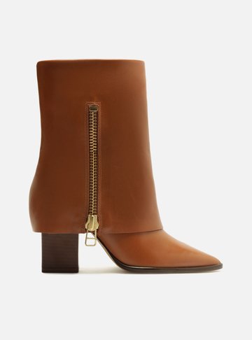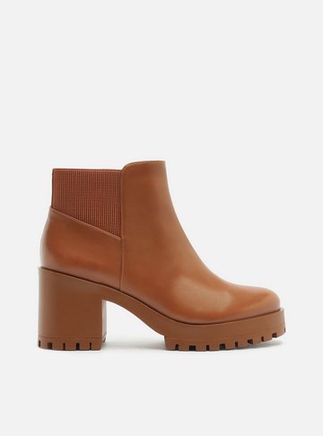 Bota feminina marrom. O sapato tem cano médio, salto médio bloco e formato arredondado na ponta. Traz cabedal ajustado ao pé e costuras no cano.
