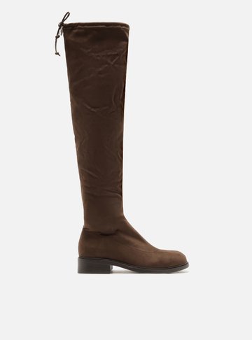 Bota feminina marrom em couro. O sapato tem cano alto que cobre os joelhos e salto bloco. Traz cano com efeito amassado e fecho em zíper na lateral interna do cano. Com recorte na parte superior e traseira do cano.