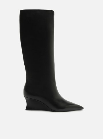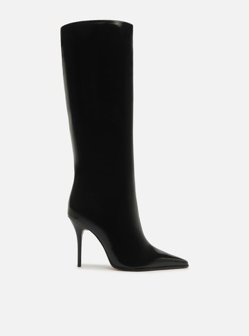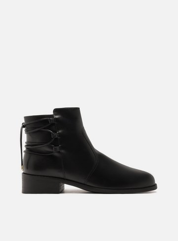 Bota feminina preta couro. O sapato tem cano médio, salto médio bloco e formato arredondado na ponta. Traz cabedal ajustado ao pé e costuras no cano.