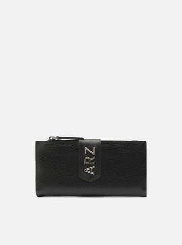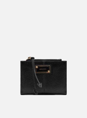 Carteira pequena marrom de couro. O acessório tem capas texturizadas, formato quadrado com laterais arredondadas e fecho superior em zíper com puxador em tiras. Traz detalhe em tira de couro liso na parte superior e aplicação metálica, geométrica e vazada na capa frontal.