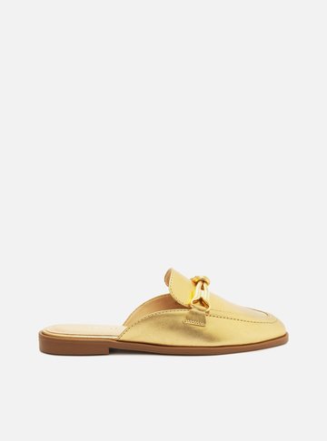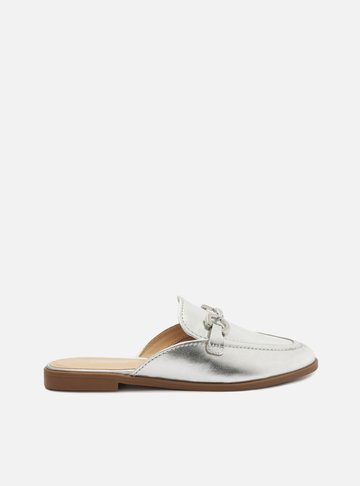 Mule prata bridão. O modelo tem salto rasteiro, base emborrachada e bico redondo. Fechada, traz recorte lateral na gáspea e aplicação de bridão metálico dourado, preso por tiras, sobre o cabedal. Possui costura bombada no contorno da biqueira. Com palmilha da cor do modelo e inscrição do nome da marca, exibe todo o peito do pé e o calcanhar.
