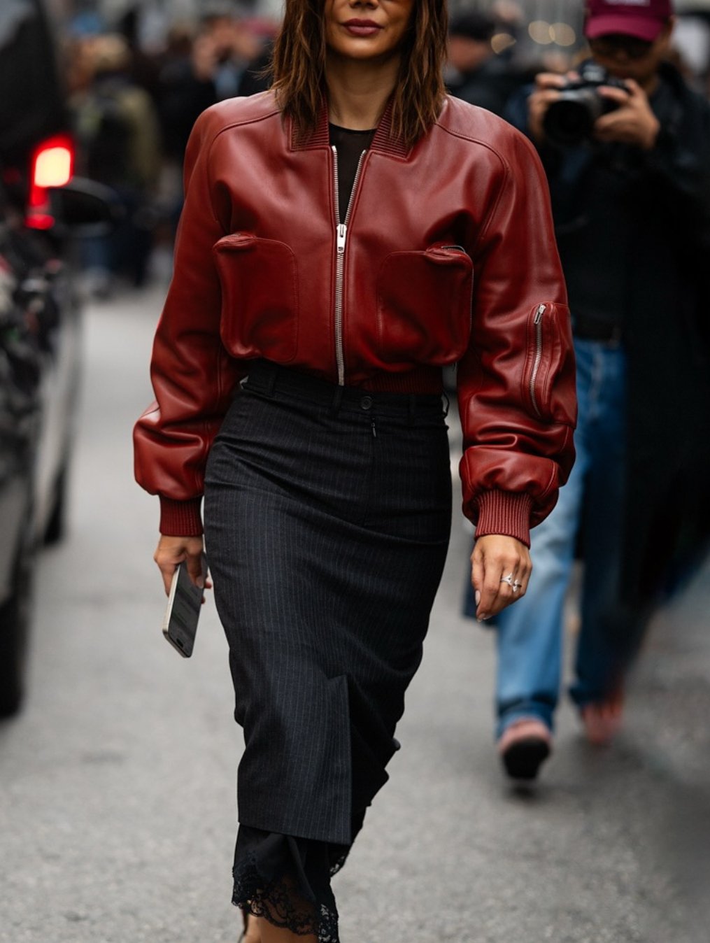 O contraste entre leve e estruturado aparece com força: vestidos e saias mais fluidos, como o estilo lingerie, ganham peso com botas e jaquetas de couro de gola alta. Ao mesmo tempo, a alfaiataria mais alinhada se equilibra com sapatilhas e mocassins. Já as jaquetas de nylon, no mood sporty, entram em contraste com acetinados, criando um hi-lo interessante e atual.
