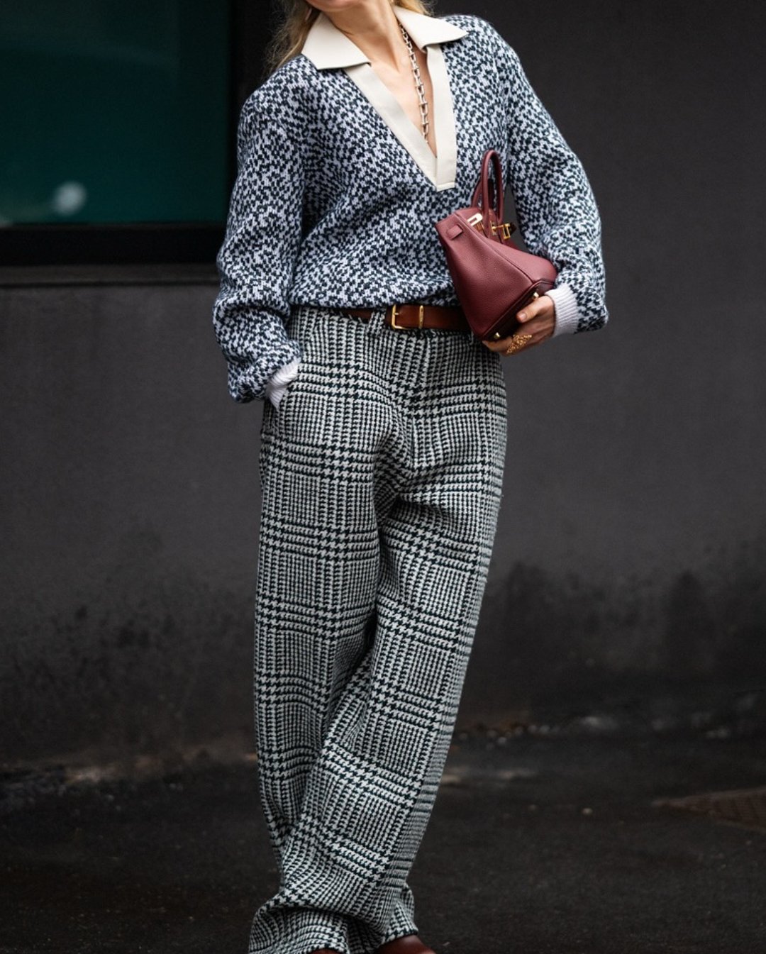 O interessante é como tudo se equilibra. Enquanto calçados e bolsas seguem uma linha mais limpa, com cores neutras e superfícies mais uniformes, o vestuário abre espaço para mais expressão. Estampas como xadrez e poá aparecem com mais frequência, além de pontos de cor que iluminam a produção.
