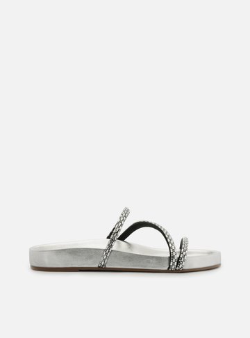 Sandália papete Off-white. O modelo tem salto rasteiro e palmilha com formato anatômico e inscrição do nome da marca. Possui solado flatform, base emborrachada tratorada e bico redondo. Traz tira fina bombada sobre os dedos e mais uma tira bombada conectada a essa, que sobe o peito do pé, contorna o calcanhar e o tornozelo e fecha em amarração superior. Deixa todo o pé à mostra.