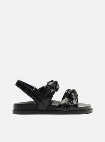 Rasteira preta de couro. O modelo tem sola flat e bico quadrado. Traz cabedal em tiras vazadas, além de costuras pesponto por todo o contorno. Com palmilha em couro da cor do modelo e inscrição do nome da marca. Aberta, exibe todo o pé.