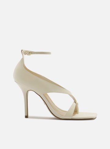 Descrição: Sandália feminina branca. O sapato tem salto alto fino e formato arredondado na ponta. Traz tira fina sobre os dedos. Possui tira fina que sai das laterais, cruza no calcanhar, contorna o tornozelo e fecha em fivela lateral. Com palmilha lisa da cor da sandália e inscrição do nome da marca. A sandália exibe todo o pé.