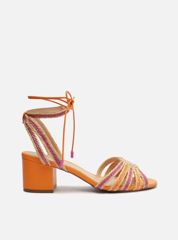 Sandália laranja. O modelo tem salto bloco e bico quadrado. Traz duas tiras trançadas sobre o pé, nas cores marrom e laranja. Possui tira em torno do calcanhar e mais um tira bombada no tornozelo com ponteiras e fecho em nó frontal. Com palmilha da cor do modelo e inscrição do nome da marca. A sandália exibe todo o pé.
