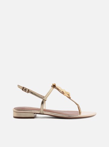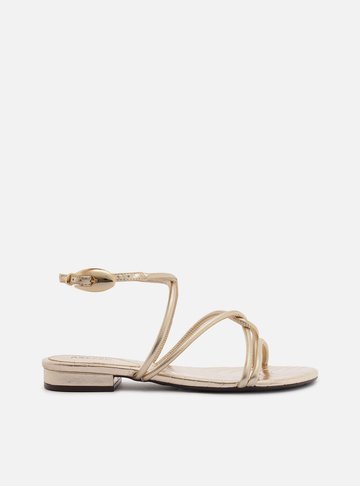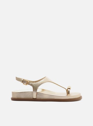 Sandália rasteira feminina dourada com acabamento envernizado. O sapato tem palmilha lisa com formato anatômico e gravação do nome da marca. Possui solado flatform, base emborrachada e formato arredondado na ponta. Traz tira média que cruza a parte superior do pé, contorna o calcanhar e vai até a outra lateral, fechando em fivela metálica dourada, além de tira fina em torno do dedão.