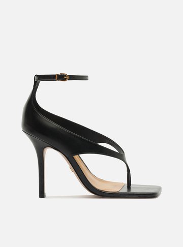 Sandália feminina preta em couro. O sapato tem salto alto fino e formato arredondado na ponta. Traz tira média sobre os dedos. Fechada no calcanhar, possui tira fina em torno do tornozelo com fivela metálica lateral. Com palmilha bege e inscrição do nome da marca.