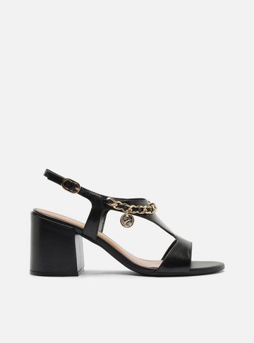 Sandália feminina preta em couro com aplicação de rebites dourados. O sapato tem salto médio bloco e formato arredondado na ponta. Traz tira média sobre os dedos. Possui tiras largas que saem das laterais, cruzam e contornam o tornozelo e fecham em fivela grande e arredondada na lateral. Com palmilha da cor da sandália e inscrição do nome da marca. A sandália exibe todo o pé.