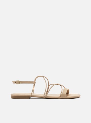 Descrição: Sandália bege nude de couro. O modelo tem salto rasteiro e bico redondo. Traz três tiras finas e bombadas sobre os dedos, unidas por enlace central. Possui tira fina em torno do calcanhar e mais duas tiras bombadas no tornozelo com ponteiras metálicas e fecho em nó frontal. Com palmilha da cor do modelo e inscrição do nome da marca. A sandália exibe todo o pé.