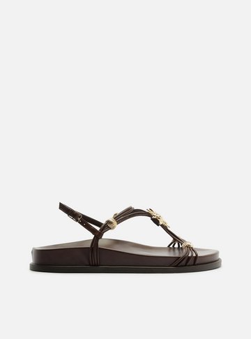 Sandália marrom de couro. O modelo tem salto rasteiro, palmilha com formato anatômico e gravação do nome da marca. Possui solado flatform, base emborrachada e bico redondo. Traz cabedal em tiras vazadas e formato H, além de costuras pesponto por todo o contorno. Possui tiras no peito do pé com fecho em fivela metálica lateral grande. Deixa parte do pé à mostra.