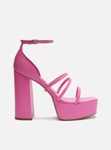 Descrição: Sandália rosa de couro. O modelo tem salto alto bloco, flare e revestido em couro, e bico quadrado. Traz tira larga e única no cabedal, que cobre parte do peito do pé. Aberta, exibe dedos, peito do pé e calcanhar. Com palmilha da cor da sandália e tag do nome da marca.