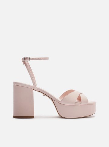 Sandália rosa couro. O modelo tem salto médio fino e bico quadrado. Traz tiras finas bombadas cruzadas sobre os dedos, e uma cruzada sobre o peito do pé, fechando em fivela lateral. A sandália é aberta e exibe dedos e calcanhar.