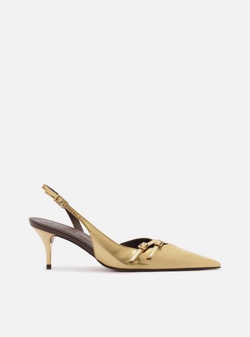 Scarpin laranja. O sapato tem salto baixo fino e ponta fina. Traz cabedal fechado com recorte arredondado na parte superior do pé, além de tira fina em V com fivela lateral. Possui tira fina conectada ao cabedal, que segue pelas laterais, contorna o calcanhar e fecha em fivela metálica. Com palmilha da cor do scarpin e nome da marca.