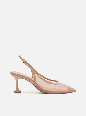 Scarpin nude em verniz. O modelo tem salto médio fino e bico fino. Aberto, traz recorte geométrico no cabedal. Possui tira fina conectada ao cabedal, que segue pelas laterais, contorna o calcanhar e fecha em fivela metálica. Tem mais duas tiras afiveladas sobre o peito do pé, sendo uma na diagonal. Com palmilha da cor do modelo e inscrição do nome da marca. Exibe todo o peito do pé e parte traseira.