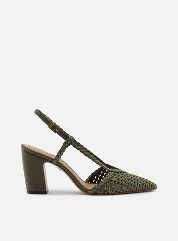 Scarpin verde. O sapato tem salto baixo fino e ponta fina. Traz cabedal fechado com recorte arredondado na parte superior do pé, além de tira fina em V com fivela lateral. Possui tira fina conectada ao cabedal, que segue pelas laterais, contorna o calcanhar e fecha em fivela metálica. Com palmilha da cor do scarpin e nome da marca.