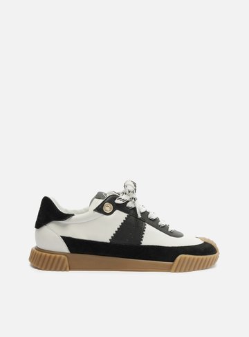 Tênis prata de couro. O modelo de amarração tem solado baixo emborrachado branco. Traz cabedal liso. De bico redondo, o tênis tem fecho em cadarços brancos e nome da marca na lateral.